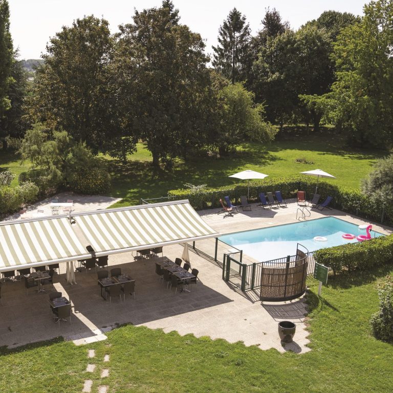 Aux beaux jours, vous pouvez profiter d’un grand parc extérieur, pour flâner, vous régaler en terrasse, au bord de la piscine, du petit-déjeuner au diner.